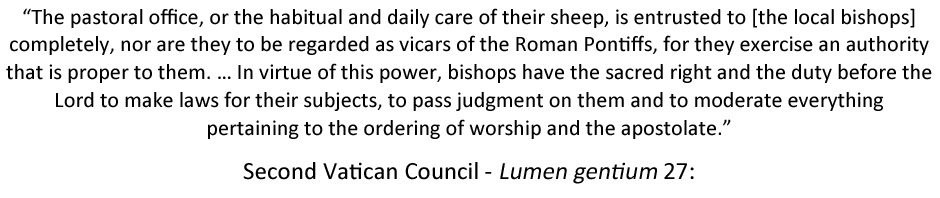 It is not just about elevating VaticanII to a doctrinal council, rather than the purely pastoral Council that Pope St John XXIII convened, but also a selective reading of the documents. Gregory DiPippo has pointed out the following passage from Lumen Gentium (n. 27): “The pastoral office, or the habitual and daily care of their sheep, is entrusted to [the local bishops] completely, nor are they to be regarded as vicars of the Roman Pontiffs, for they exercise an authority that is proper to them. … In virtue of this power, bishops have the sacred right and the duty before the Lord to make laws for their subjects, to pass judgment on them and to moderate everything pertaining to the ordering of worship and the apostolate.” (H/T Rorate Caeli)