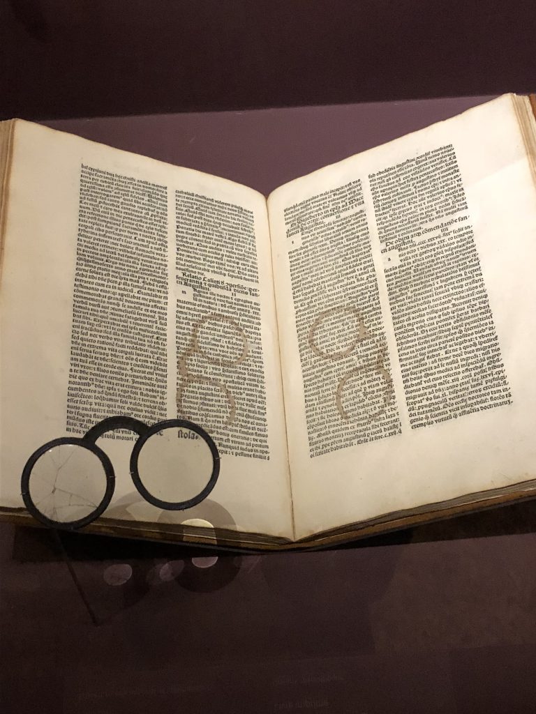As for the spectacles, I recall that in the rooms of St. Philip Neri at the Chiesa Nuova, there are preserved a pair of Pippo’s cheaters.  And, some time ago, in Paris I saw a book in the Museum of Cluny that had been stored away for centuries with some guy’s glasses in the pages, leaving a mark.