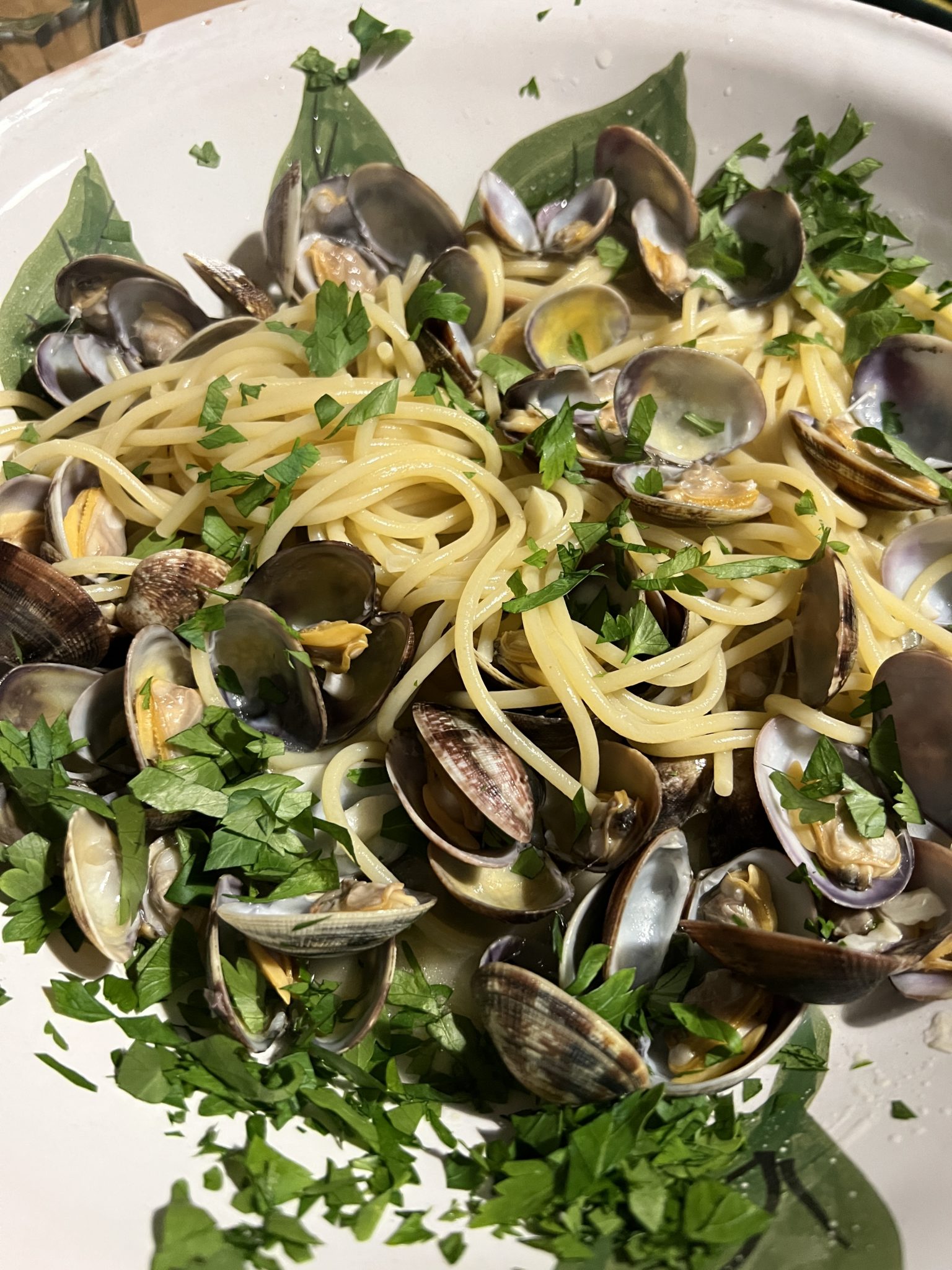 Last night spaghetti alle vongole.   The fishmonger says that the clams had already been purged.  Last time, however, … well… I should have given them another round.  Then, it was okay but there was some fine sand.   This time, a few hours in salty water did the trick.