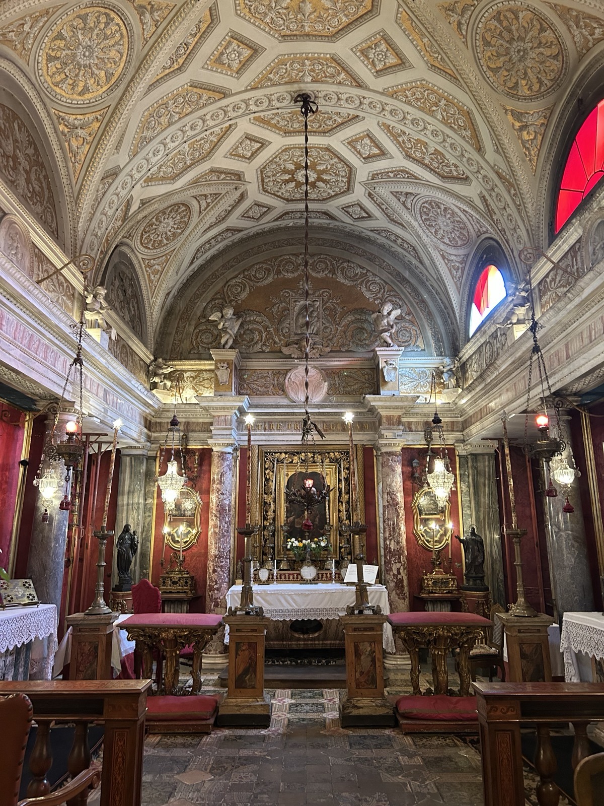 The chapel of an old Roman family in the Palazzo Massimo. It has the status of a church. The Palazzo is open once a year on the anniversary of a miracle worked by St. Philip Neri: he raised the Prince’s son from the dead. Priests are able to celebrate Mass in the chapel on this day. I have done so many times, though not lately.